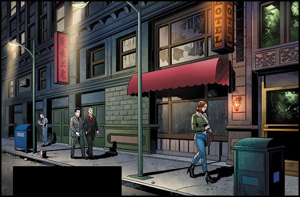 The sensation started as an itch between her shoulder blades, the primitive awareness that something nearby was watching her. She resisted the urge to look back, to actually turn her head around, but her eyes strained at the corners of her peripheral vision, trying to catch a glimpse of whatever was behind her. There. As she turned a corner, she caught a glimpse of two shapes in the distance, keeping pace with her. Two men. Dark suits.